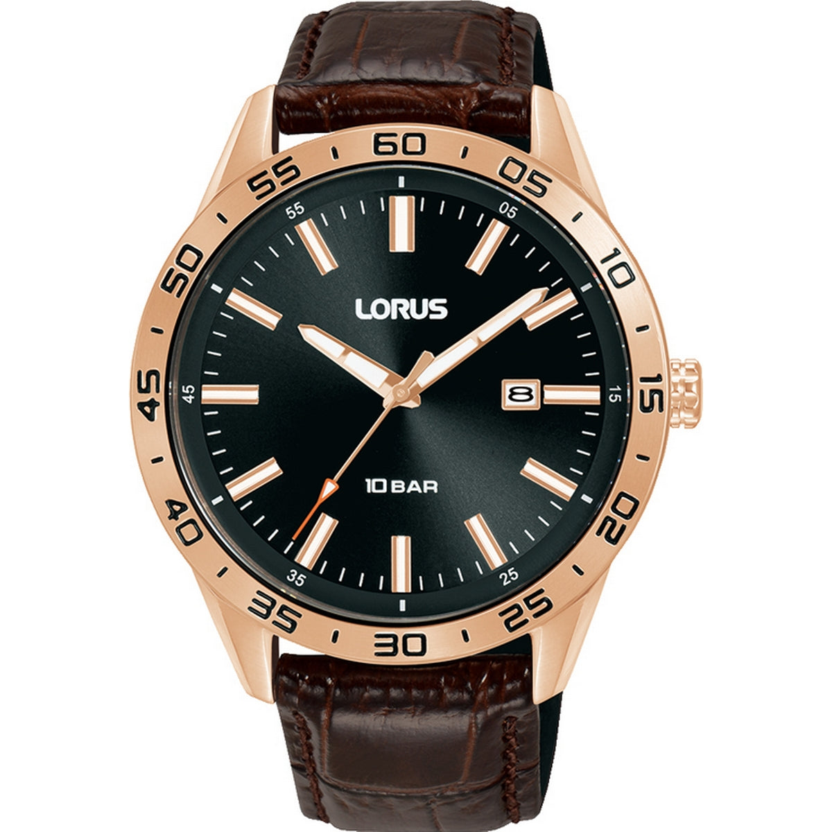 LORUS QUARTZ GENTS ROSE GOLD BLACK DIAL STRAP WATCH