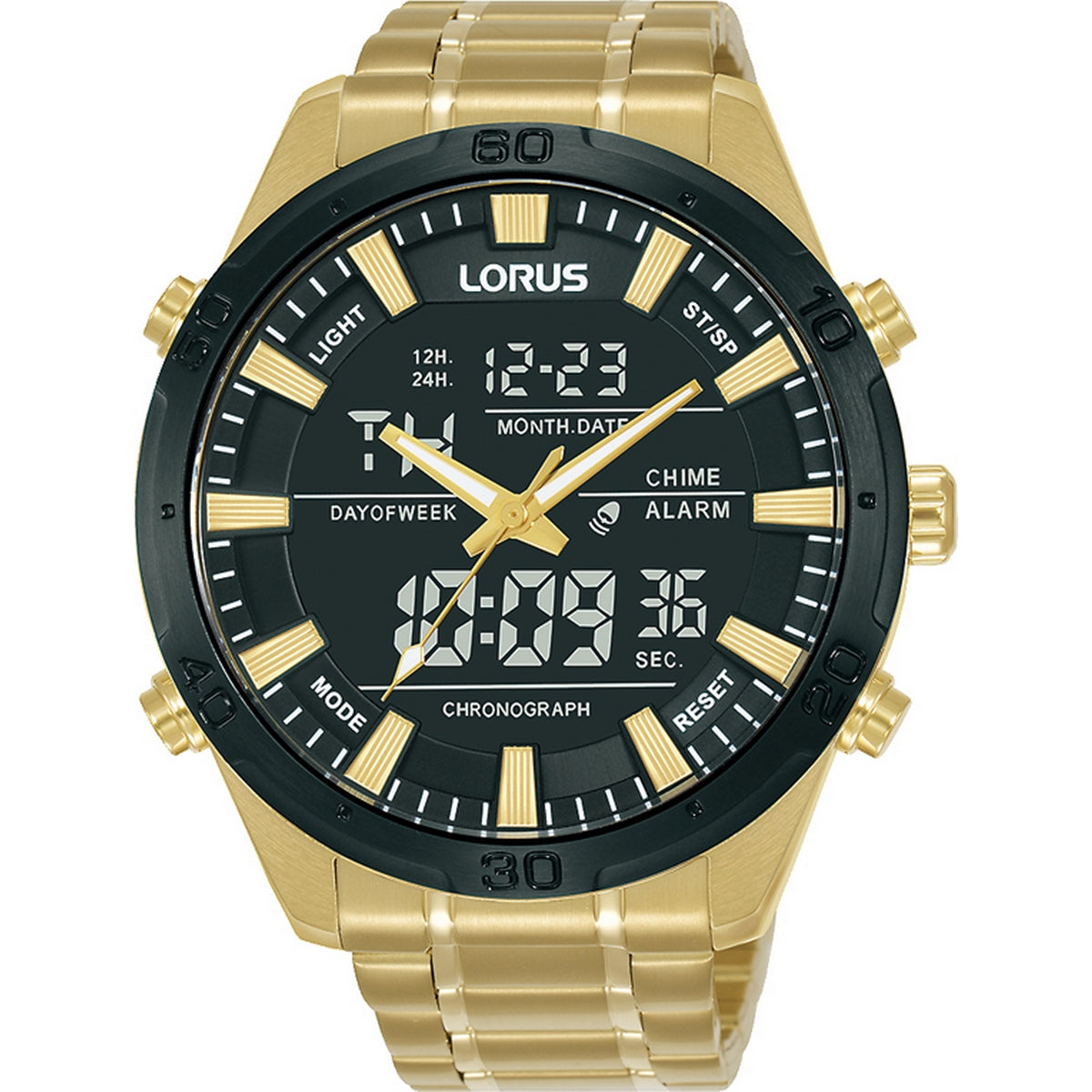 LORUS QUARTZ DUAL TIME GOLD PLATED BLACK DIAL BRACELET WATCH