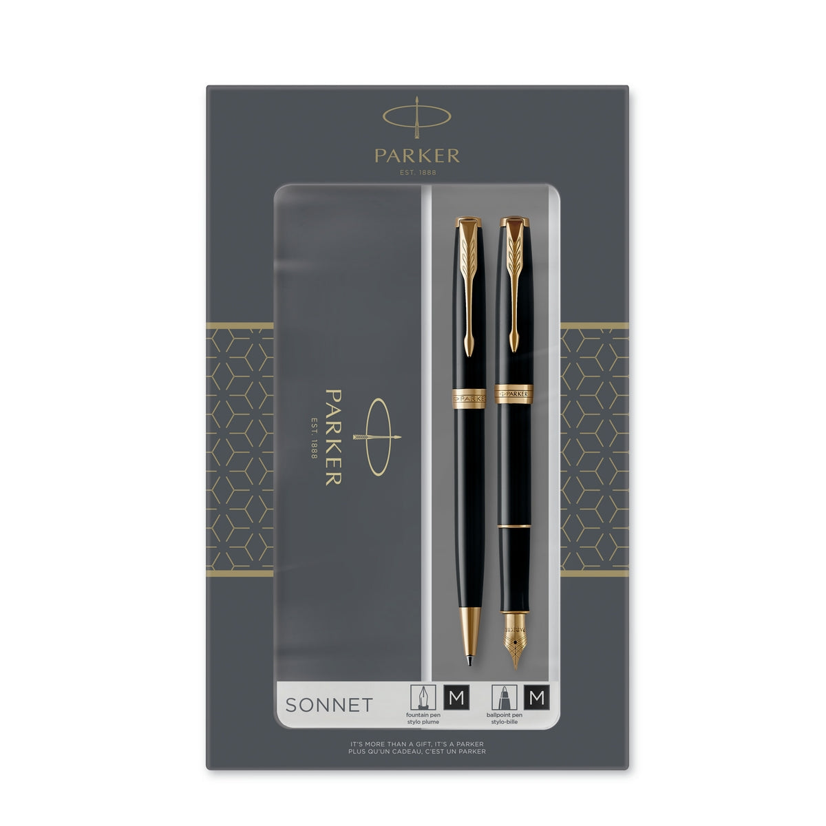 parker sonnet duo gift set with ballpoint pen & fountain pen (18k gold nib) gloss black with gold trim black refill & cartridges
