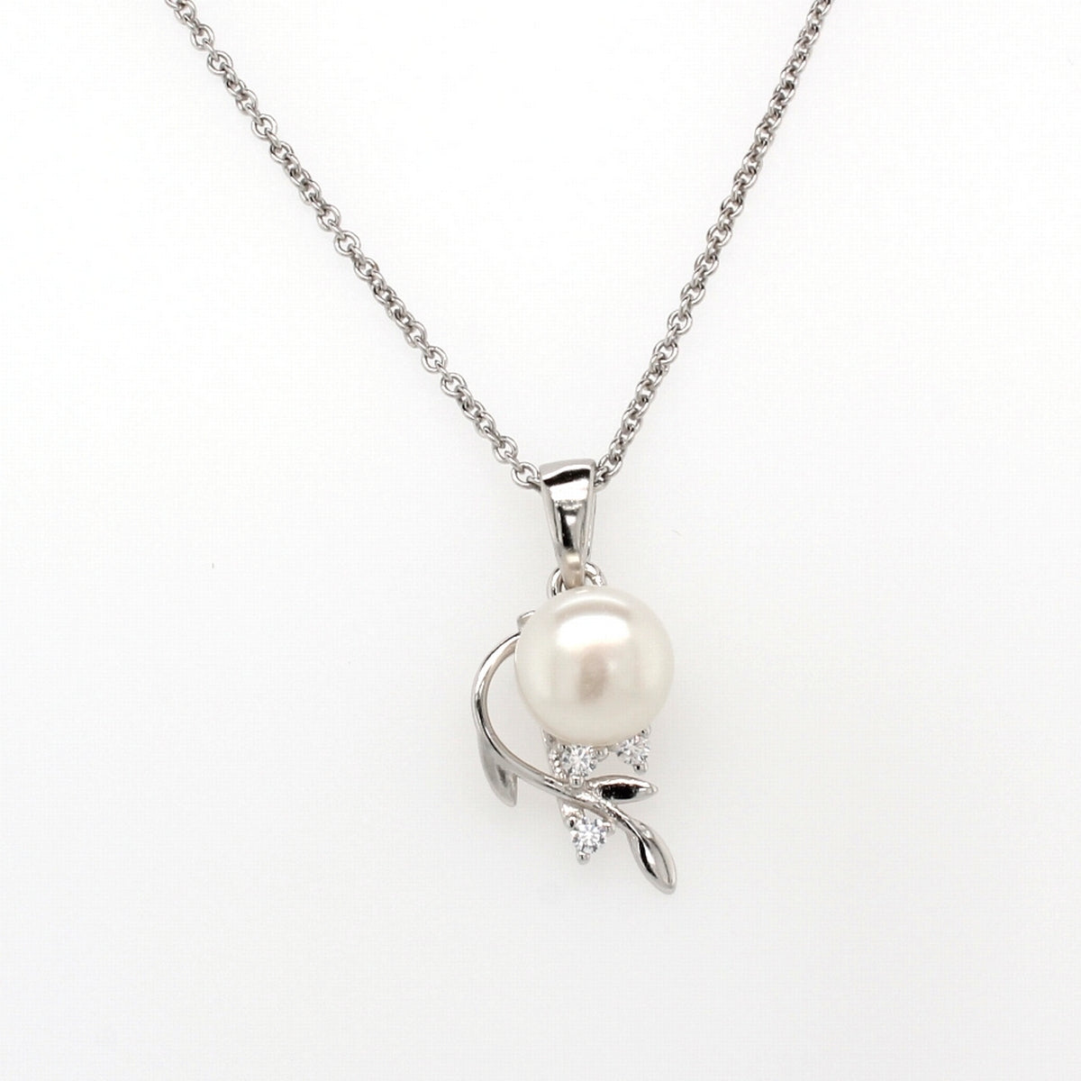 Silver Pearl And Cluster CZ Leaf Set Pendant 7.5mm on 45cm Chain A