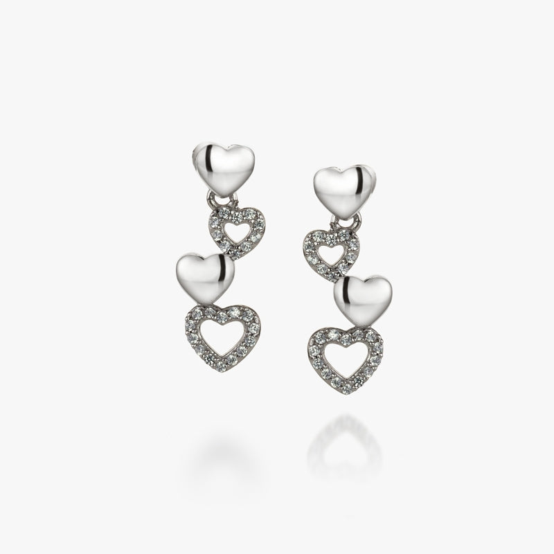 earring 4 hearts in a row, 2 plain and 2 stone set outline
