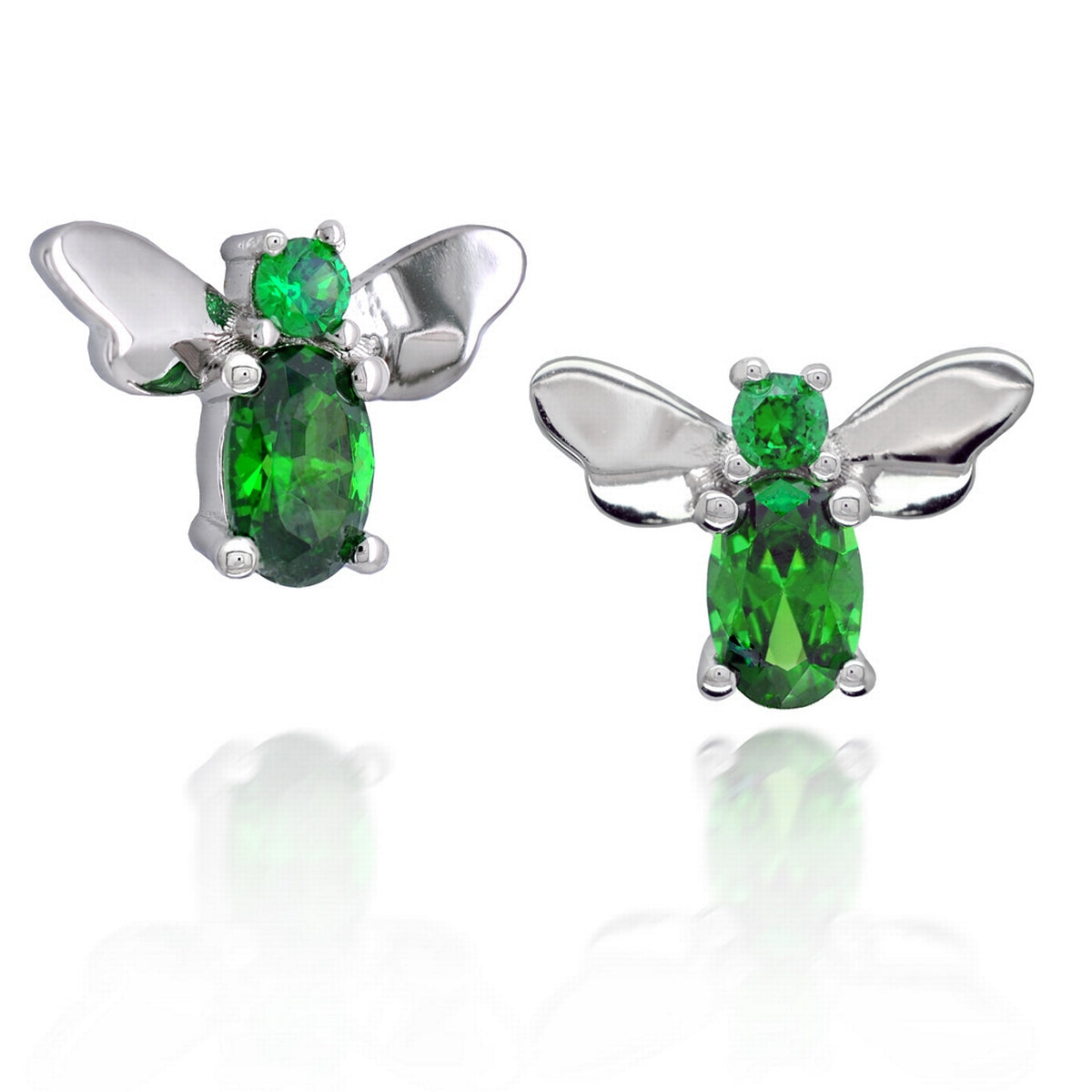 REAL EFFECT STONESET AND SILVER BEE WITH EMERALD LIKE HEART SHAPE STONE STUD EARRINGS