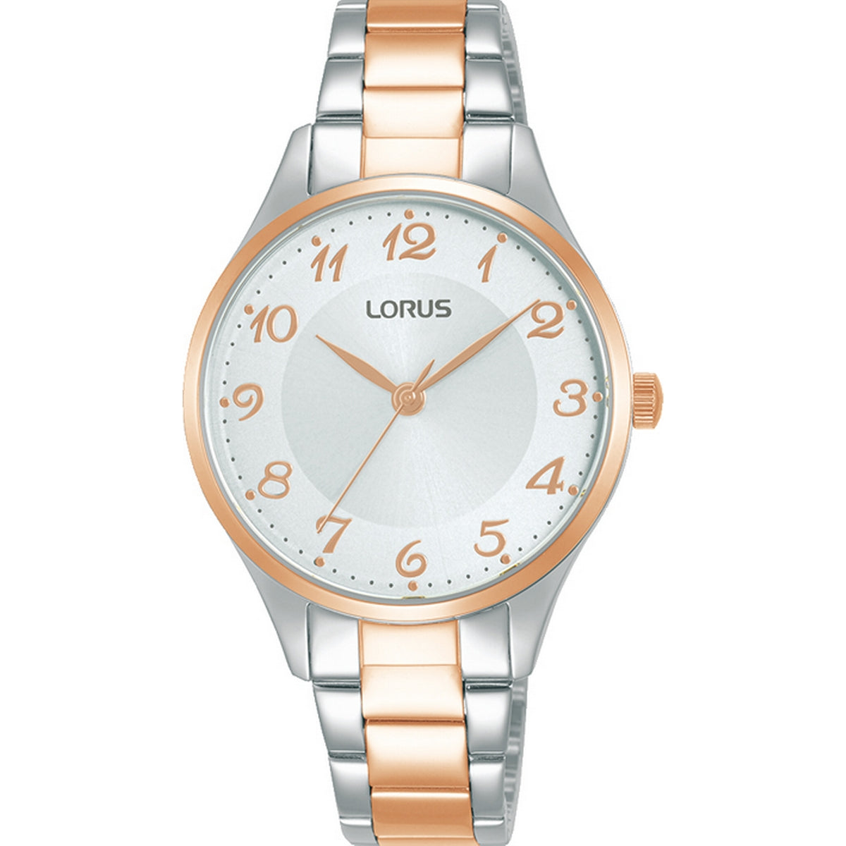 LORUS QUARTZ LADIES TWO TONE ROSE STAINLESS STEEL WHITE DIAL BRACELET WATCH