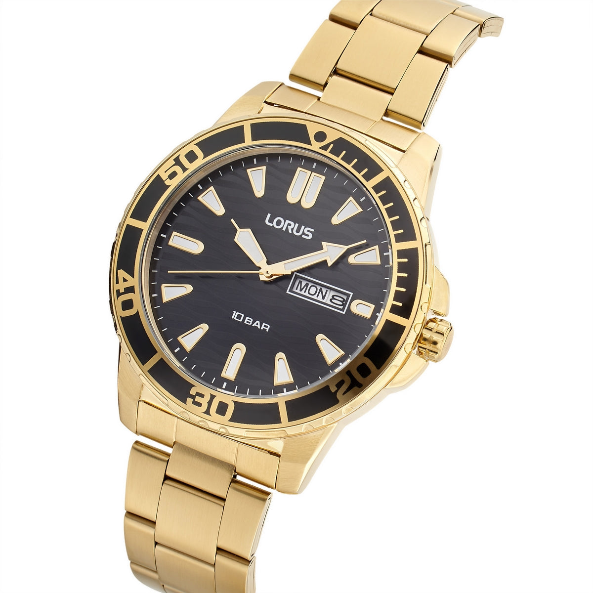LORUS QUARTZ GENTS GOLD PLATED BLACK DIAL BRACELET WATCH
