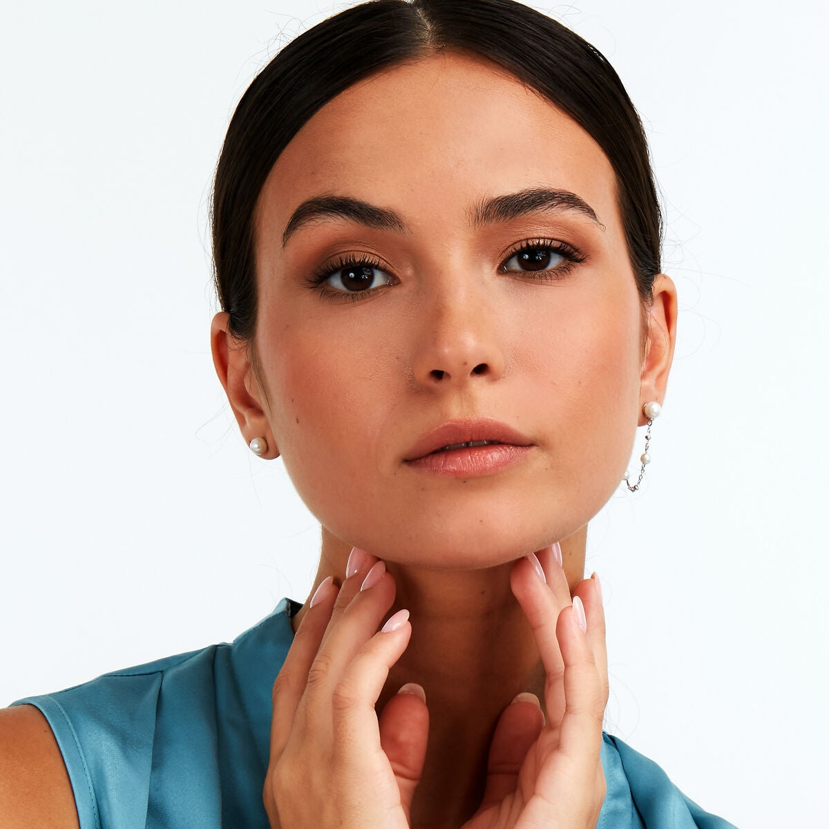 perla stud earrings 925 silver pearl with 1 drop chain side