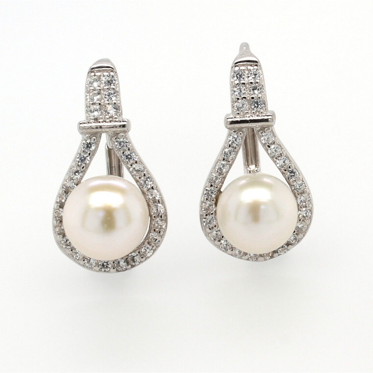 Silver Round Pearl Trardrop CZ Set Leverback Earrings 7mm